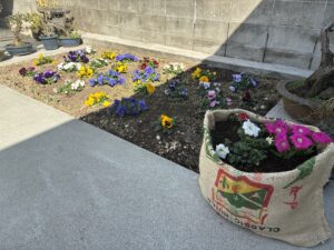 手前の麻袋はペチュニア(本日植え込み)