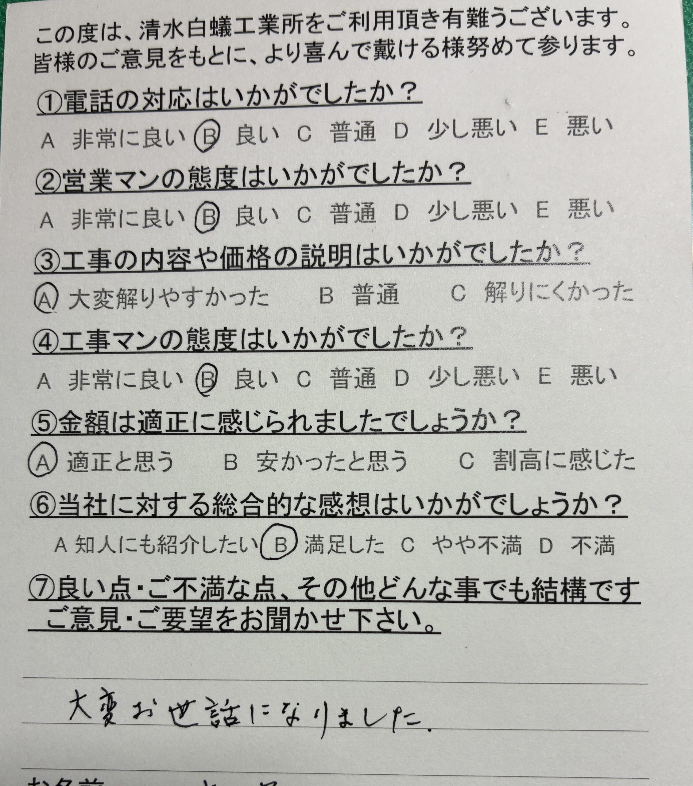 - ④工事マンの態度はいかがでしたか?